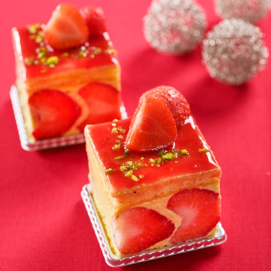 しっとりとしたジェノワーズとピスタチオのムースリーヌとの絶妙なバランスをお楽しみください。