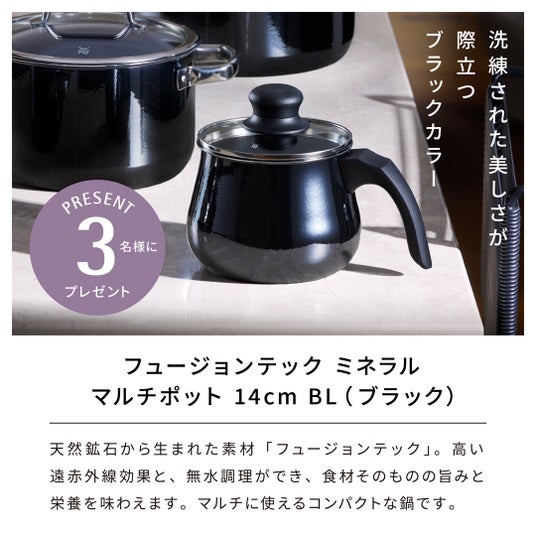 今回のプレゼントキャンペーンでは、11月に発売された「フュージョンテック ミネラル」の新色「BL(ブラック)」より、コンパクトで多様な用途で使える「フュージョンテック ミネラル マルチポット 14cm BL」を抽選で3名様にプレゼントいたします。