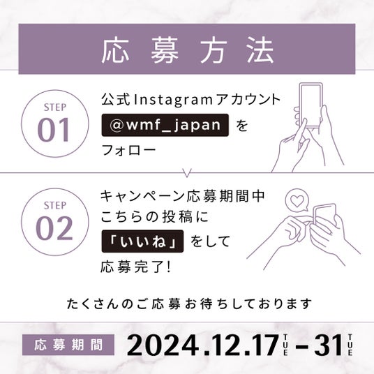 ※WMFの公式インスタグラムアカウントを装った「偽アカウント」にご注意ください。当選のダイレクトメッセージを受け取った場合は、必ずDMの送付元アカウントが @wmf_japanであることをご確認ください。