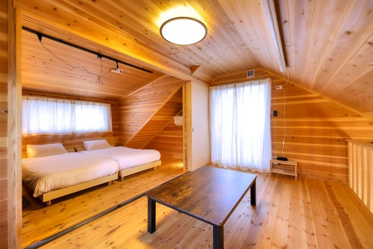 Pom最大6名まで宿泊可能なログハウス。専用のバレルサウナやリラックススペースでおくつろぎいただけます。