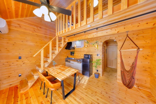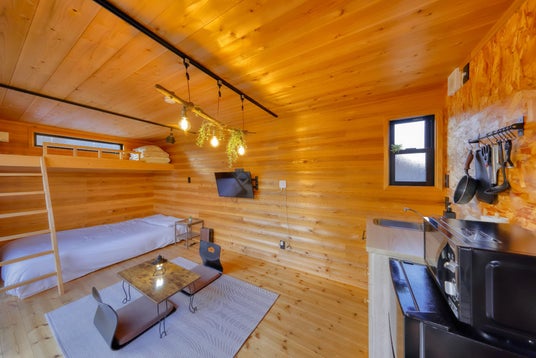 最大6名で泊まれる「Pom」は、バレルサウナ付きのおしゃれなログハウス。キッチンやプロジェクターも完備しており、多彩な滞在を実現いたします。