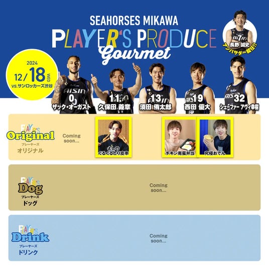 12/18(水)サンロッカーズ渋谷戦にて、「からあげナイト」ともに選手プロデュースグルメの販売も行います!今回登場するのは、久保田選手プロデュースの「くるくるとり皮串」と西田優大選手の「チキン南蛮弁当」「究極おでん」、長野選手の「加賀棒茶のジェラート」です!
