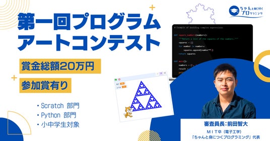 小中学生向けに楽しくPythonを使ったテキストプログラミングのオンラインクラスを提供してきた「ちゃんと身につくプログラミング」(以下、ちゃんプロ)は、小中学生がプログラミングを使って自分の自由な発想で作品を作成する「プログラムアートコンテスト」を開催します。