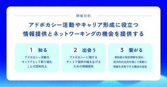 このイベントでは、アドボカシー活動やキャリア形成に役立つ情報提供とネットワーキングの機会を提供することを目的としており、将来的には日本における国際協力・グローバルヘルス分野におけるアドボカシーリーダーをサポートすることを目指しています。