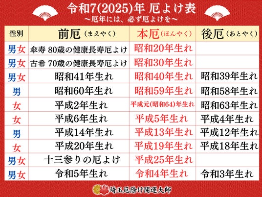 令和7年(2025)の厄年早見表【年齢(生まれ年)別】