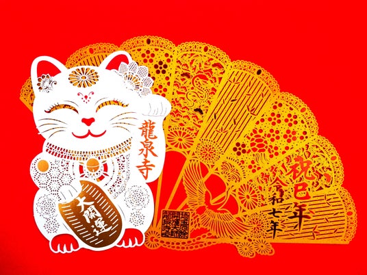 初詣限定切り絵御朱印「大開運の招き猫と黄金の扇子」