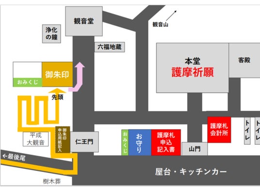 御朱印はオレンジの線にお並びください。お並びの途中の仁王門横に御朱印申込書記入所がございますので、授与する御朱印の枚数を申し込み用紙にご記入ください。
