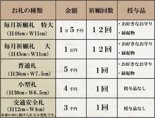 1万5千円のお札は毎月祈願の際、個別にお名前も読み上げます。