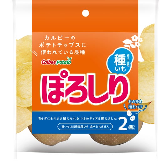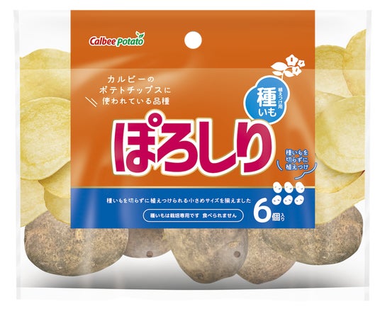 栽培用種芋『ぽろしり』は、カルビーポテトが10年以上かけて開発したオリジナルのじゃがいも品種です。切らずにそのまま植えつけるのに適したサイズを揃えました。カルビーポテトではこの商品で初めてホームセンターでの販売に取り組みます。