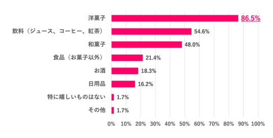 配られて嬉しいお歳暮は、「洋菓子」が86.5%、次いで「飲料」54.6%、「和菓子」48.0%となり、手軽に飲食ができるお菓子や飲み物が人気であることがわかりました。その他の回答としては、「コスメ」、「ギフトカタログ」、「どんなものでも嬉しい」などがありました。