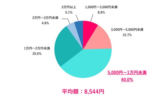 クリスマスプレゼントの一人当たりの予算は、「5,000~1万円未満」が40.0%で最も多く、次いで「1万円~2万円未満」25.6%、「3,000~5,000円未満」15.7%と続きました。平均額は8,544円でした。