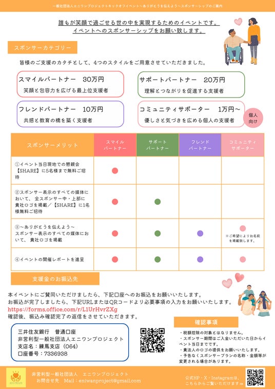 クラウドファンディングと同時に、一般社団法人エニワンプロジェクト設立記念イベント「ありがとうを伝える会」の趣旨にご賛同いただけるスポンサー(法人・団体・個人の方)を募集しています。