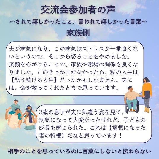 この3つの交流会を開催し、患者と家族(友人・支援者)双方のお話を伺う中で、患者側は、病気や障がいを抱えていることで「ごめんなさい」と言いがちな場面が多いことを実感し、支える側は、患者から「ありがとう」を聞くことで心が軽くなると感じた瞬間を目の当たりにしました。