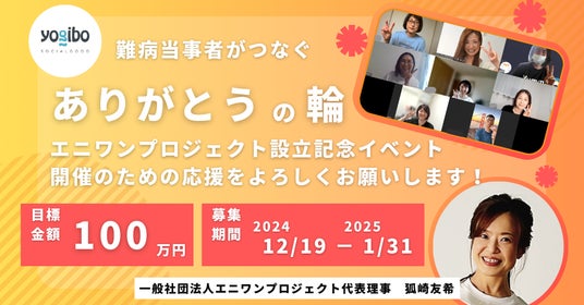 難病当事者で2025年5月から活動を開始し、疾患や立場を超えた方々をつないできた「エニワンプロジェクト」が、2025年11月5日に『一般社団法人エニワンプロジェクト』(本社:東京都練馬区、代表理事:狐崎友希)として設立しました。第一歩として設立記念イベント【ありがとうを伝える会】を2025年3月8日(土曜日)に都内会場とオンラインのハイブリット形式で開催します。難病や障がいを抱える患者と、支える家族・友人・支援者、双方の感謝メッセージ発表、患者と支援者によるディスカッション、会場参加者限定の懇親会を予定。