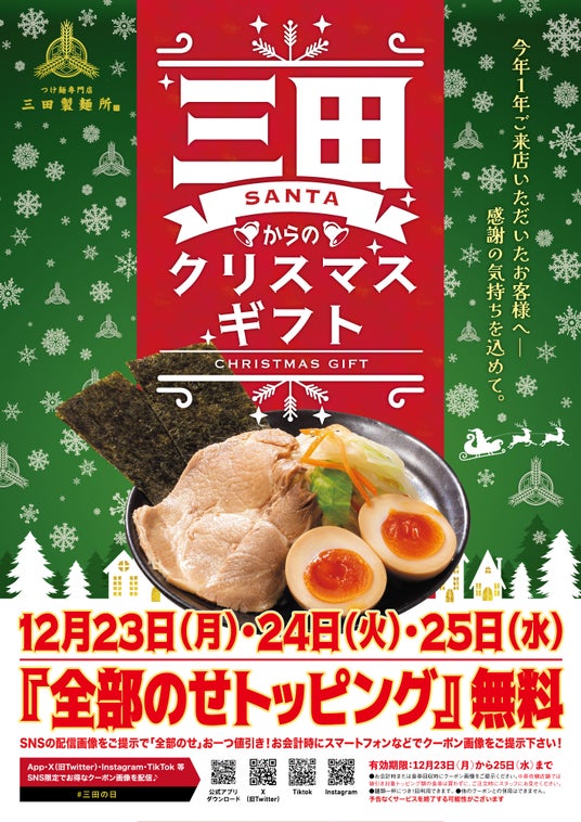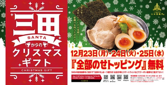 株式会社エムピーキッチンホールディングス(本社:東京都渋谷区、代表取締役:村上竹彦)が運営する『三田製麺所 』は、『全部のせトッピング無料』のキャンペーンを12月23日(月)・24日(火)・25日(水)の3日間開催いたします。