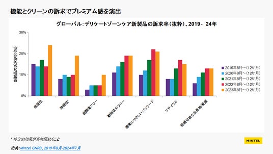 過去5年、デリケートゾーンケアの新製品では、保湿性・持続性(*)といった機能、さらに安全性やエコ・エシカルなどといった、人・自然環境に害がない「クリーンビューティ」の訴求率が上昇しています。消費者は主に汚れやにおいを取り除くことを求めてデリケートゾーンケア製品を使用していると思われますが、ブランドはこうした付加価値を訴求してプレミアム感を演出していると考えられます。