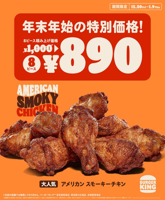 2024年12月20日(金)~2025年1月9日(木)の3週間限定で、スモーキーな香りと7種類のスパイスが特長の『アメリカン スモーキーチキン 8ピース』を、積み上げ価格1,000円のところ、年末年始の特別価格として110円引きの890円で発売いたします。