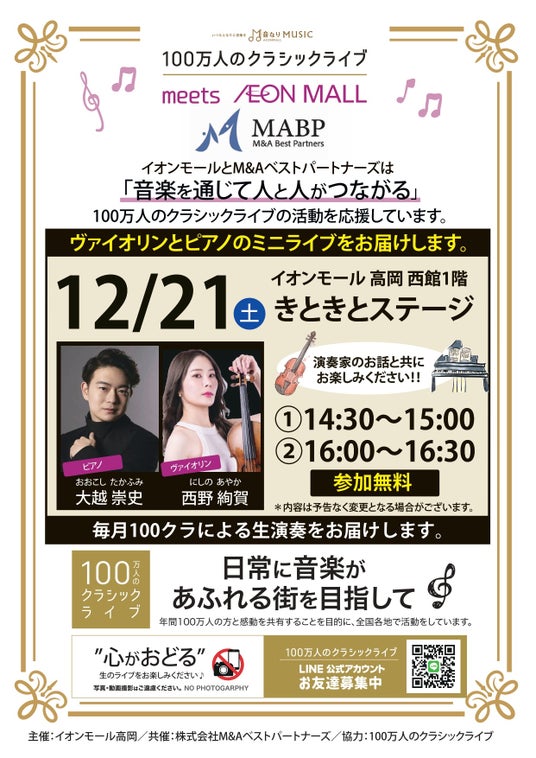 製造、建設、不動産、医療・ヘルスケア、物流、ITに特化したM&A仲介を行う株式会社M&Aベストパートナーズ(本社:東京都千代田区、代表取締役社長:齋藤 達雄 以下M&Aベストパートナーズ)と、一般財団法人100万人のクラシックライブ(東京都千代田区、代表理事:蓑田秀策 以下100万人のクラシックライブ)は12月21日(土)14:30/16:00より、イオンモール高岡にて、クラシックライブを開催することをお知らせいたします。