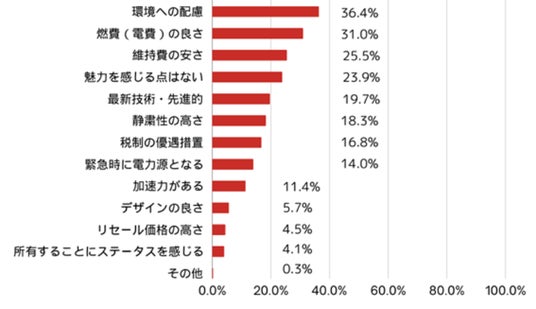 電気自動車(BEV車)のどんな点に魅力を感じるかを聞いたところ、「環境への配慮」が36.4%でトップ、続いて「燃費(電費)の良さ」、「維持費の安さ」と続きました。近年の持続可能な社会の実現に向けた社会の風潮が反映されつつ、燃費や維持費など実用的な面での評価も得る結果となりました。
