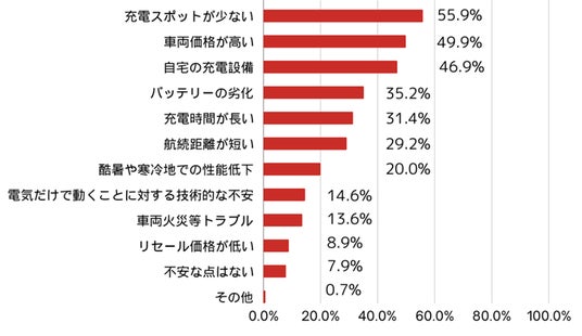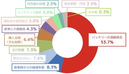 中古車での電気自動車(BEV車)購入を検討する場合、最も気になる点を聞いたところ、「バッテリーの消耗具合」と回答した人が約半数を占めました。一方で「懸念点はない」と回答した人も3番目に多い7.4%となり、中古車であることを気にしていない人も一定数見られることが分かりました。