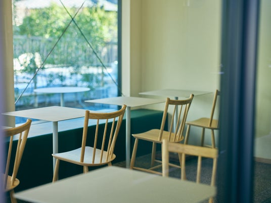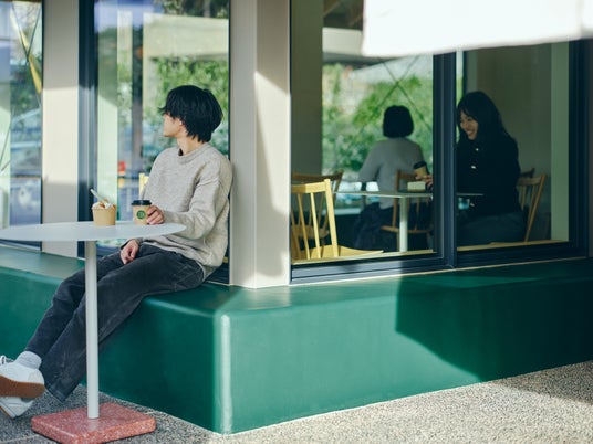 大きな開口部で囲まれたカフェスタンド。外側には縁側のイメージで、床面を立ち上がらせた形のベンチを建築と一体化する形で設けています。