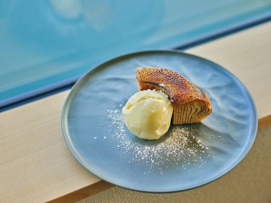 イートインメニュー:バウムクーヘンの表面をカラメリゼしたブリュレ風の琥珀(こはく)