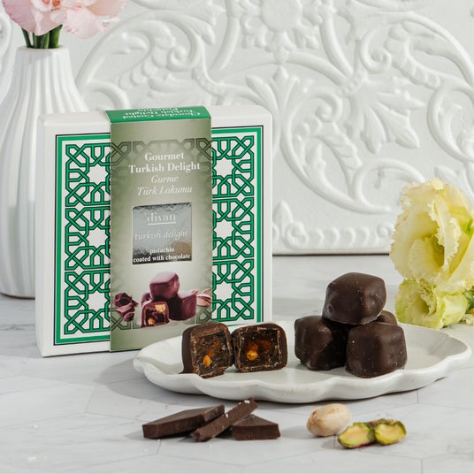 チョコレートピスタチオターキッシュディライト(ロクム)モダンで味わい深いdivan(ディヴァン)の看板商品。“天才たちのスイーツ”としても知られるターキッシュディライト(別名:ロクム)は、欧米では有名なお菓子。ダブル焙煎したピスタチオを贅沢に使いオリジナルレシピで作られた濃厚なビターチョコレートでコーティングしました。