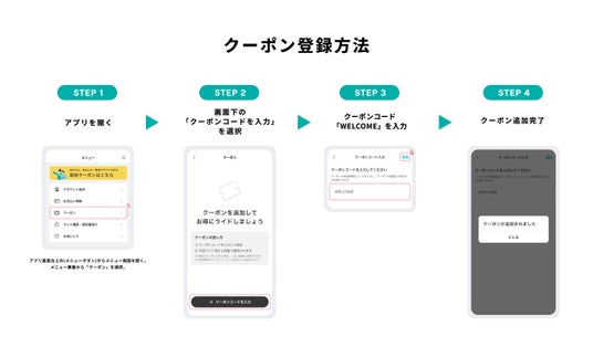 ・本キャンペーンのクーポンコードは、必ず初回のライド前にご登録ください。