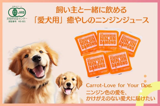 同社が販売する「NINJIN DAMONO」は、OMOTENASHI Selectionを受賞した高品質なニンジンジュースで、これまでは主に人間向けに提供されてきました。同シリーズから、愛犬と飼い主が一緒に楽しめる「癒やしのニンジンジュース」が新たに登場し、わんちゃん業界で大きな注目を集めています。
