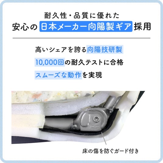10000回の耐久テストに合格した日本メーカー向陽技研製のギアを採用しています。高い耐久性と安心の品質で、長期間にわたって快適にお使いいただけます。