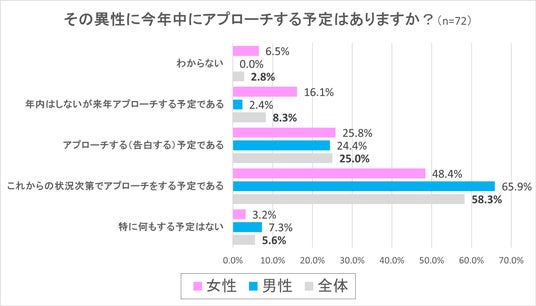 この設問では前の設問で「クリスマスで会う予定の異性の中に恋人候補として好意を寄せている異性がいる」と回答した男女72人に、その異性に対して「今年中にアプローチする予定はありますか?」と質問をしてみました。