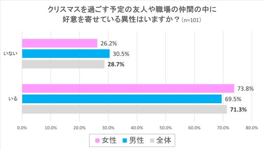 (4)クリスマスを「(友人)または(職場の仲間)と過ごす予定」のうち約7割の男女は、その中に好意を寄せる(恋人候補)がいるということが明らかに!