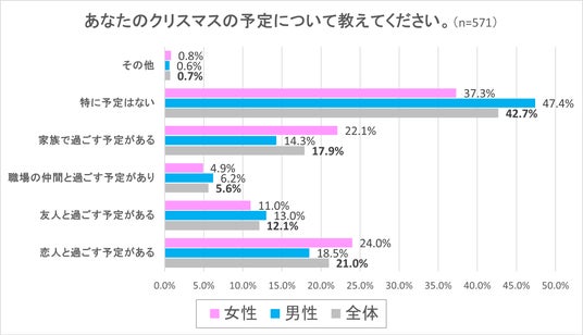 最初の設問では対象となる25~34歳独身男女571人に、「あなたの今年のクリスマスの予定について教えてください」と伺いました。全体で42.7%、男性47.4%、女性37.3%はクリスマスについて「特に予定はない」という回答結果となりました。