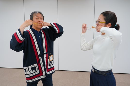 小さな弁の音を口の中で響かせて鳴らすアイヌ民族の伝統的な楽器ムックリ(口琴)の演奏方法を学べます。雨風の音、動物の声、自分の感情などを自由に表現。音色は口内の空間の大きさや息を吸う、吹くことなどで変化。自由度が高くクセになります。