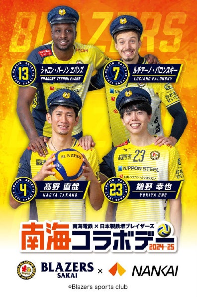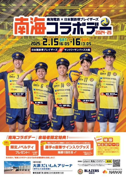 南海電気鉄道株式会社(代表取締役社長:岡嶋 信行、以下「南海電鉄」)、株式会社ブレイザーズスポーツクラブ(代表取締役社長:田下 昌孝、以下「日本製鉄堺ブレイザーズ」)では、2025年2月15日(土)、16日(日)に大浜だいしんアリーナで開催する日本製鉄堺ブレイザーズのホームゲームを共に盛り上げるべく、「南海コラボデー2024-25」と題し、南海電鉄と日本製鉄堺ブレイザーズのコラボ企画を開催します。