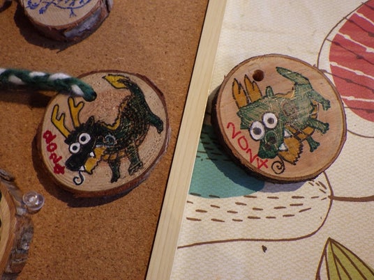 自分で選んだ木をノコギリで切って輪切りにしていただき、ヒモを通す穴を空けてマジックで夢やイラストをかいて完成です!