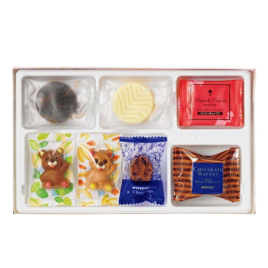かわいらしいクマがモチーフのプチベアショコラや、定番のピュアチョコレートなど、ロイズの人気商品を少しずつ気軽に食べられるようにセットしました。パッケージには、詰め合わせているチョコレートのモチーフで北海道を描き、北海道に咲く花々や動物もデザインしました。
