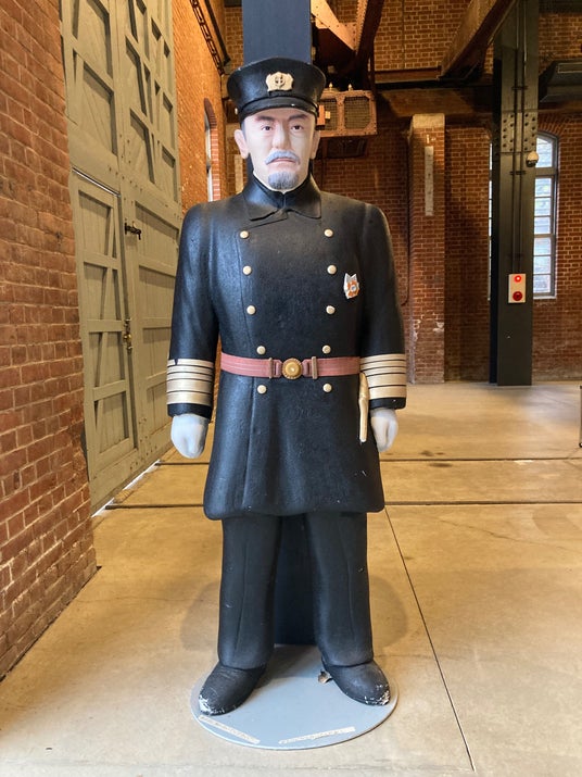舞鶴鎮守府庁舎を絵柄にしたタペストリーの前で、舞鶴鎮守府の初代司令長官東郷平八郎の人形と一緒に写真が撮れる「フォトスポット」を設置