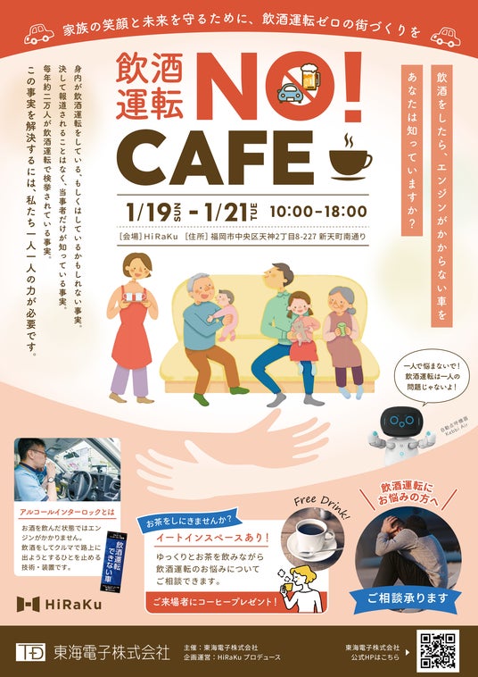 アルコール問題に対する社会的な取り組みを推進する東海電子株式会社(本社:静岡県富士市 代表取締役:杉本 哲也)は、飲酒運転の根絶を目的とした新たな取り組みとして、2025年1月19日(日)から21日(火)に、福岡市でポップアップカフェイベントを開催いたします。