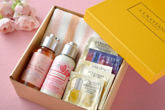 もうひとつの「L'OCCITANE 桜ステイ」は、桜の香りのシャワージェルやボディミルク等の計4点が入ったギフトセット付きステイプランです。蓋を開けると、春らしい華やかなピンク色のギフトが並ぶ見た目にもかわいらしいBOXです。