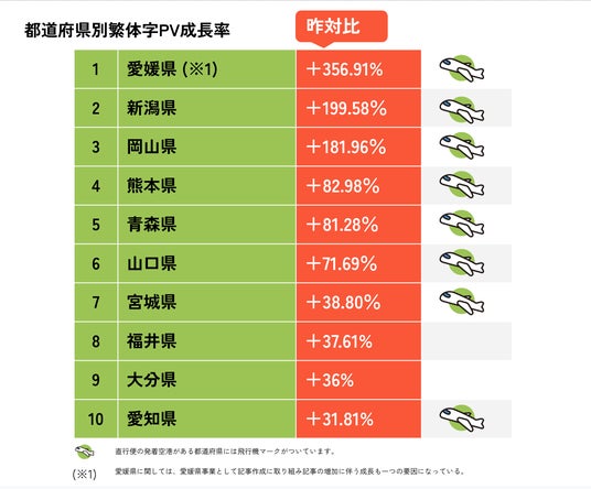 MATCHAの閲覧データから、PV増加率およびPV成長率が高い観光地の共通点として、台湾から直行便があることが挙げられます。その中でも熊本は、前年同月比でPV数が40%増加しており、関心が高まっています。