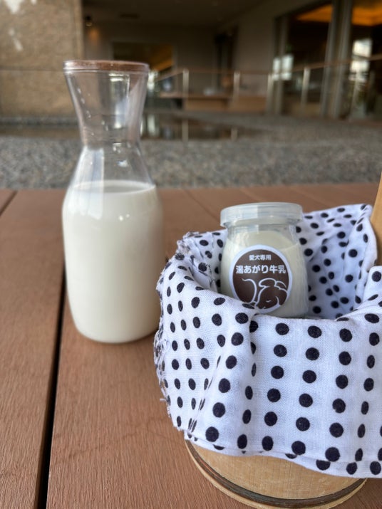 また、お風呂上りと言えば『牛乳』、イベント期間中は専用の瓶に入った『愛犬湯上り牛乳(やぎミルク)』を550円(80ml入り、テイクアウト不可)で販売いたします。湯上りで乾いたわんちゃんの喉を潤してあげてください。