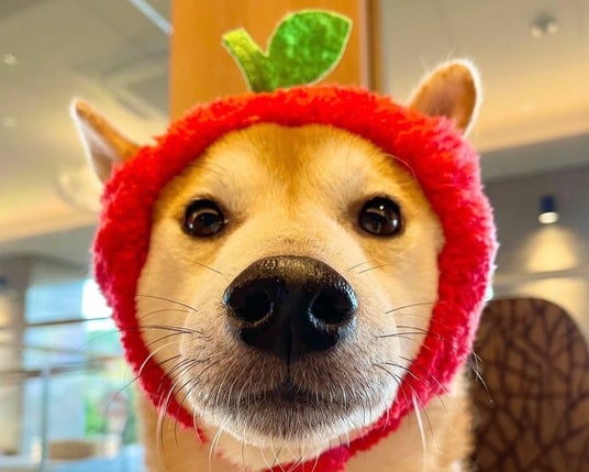 りんご帽子を被ってドヤ顔の虎太朗くん(子守犬)