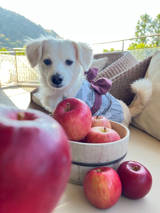 また、わんちゃんが温泉に入らない場合に備えて、自慢の大きな桶風呂にお湯の代わりにリンゴを並べた写真スポットもご用意いたします。