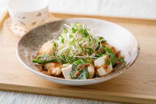 爽やかな薬味で食欲アップ!香ばしく焼き上げた鶏むね肉と水気を切った豆腐に、カットされた長ねぎ、みょうが、小ねぎの薬味をたっぷりとのせました。