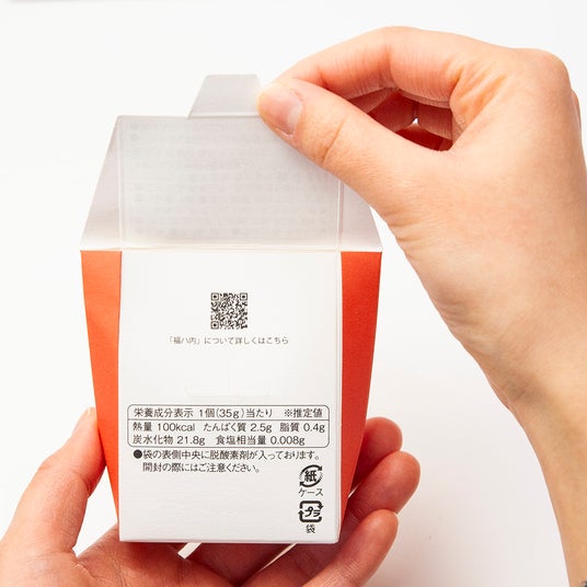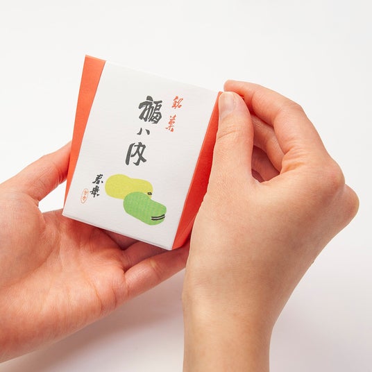 紙製のパッケージ内に、お菓子1個をフィルム包装して収めております。おひとつからお求めいただけますため、お配り用のお菓子としても、季節のお菓子とのお詰合せとしても、さらに便利になりました。従来の木箱入り商品とあわせて、ぜひこの冬「福ハ内」をご活用くださいませ。