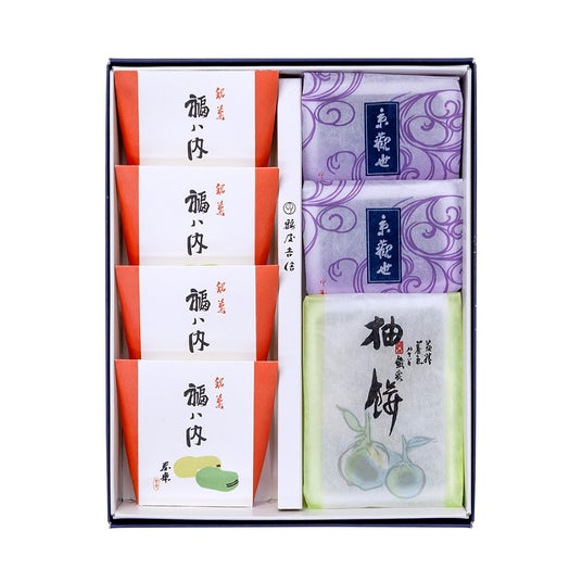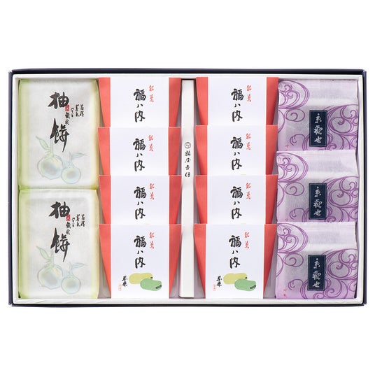 鶴屋吉信の代表銘菓である「京観世(大正9年)」「柚餅(明治元年)」と「福ハ内(明治37年)」それぞれの個包装をお詰め合わせした「名菓撰 福」シリーズを好評お取扱中です。