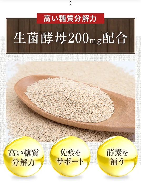 特許申請中の生菌酵母が食事から摂取した糖質を効率的に分解。高カロリーな食事を摂ったとしても吸収を抑える働きが期待できます。