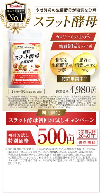 「スラット酵母」は、通常価格4,980円(税込)の商品を定期購入者限定で初回500円(税込・送料無料)でご提供。2回目以降も継続購入でお得に続けられるため、無理なく健康習慣を始めることができます。