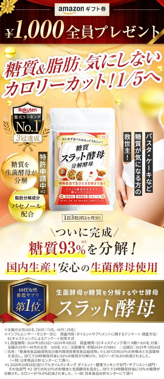 株式会社日本MOT(所在地:愛知県名古屋市、代表取締役:坪井尊征)は、生菌酵母と脂肪分解成分「パセノール」を組み合わせた独自配合で特許申請中のダイエットサポートサプリメント「スラット酵母」の【初回限定500円キャンペーン】を、2024年12月15日(日)から2025年1月15日(月)までの期間限定で実施いたします。